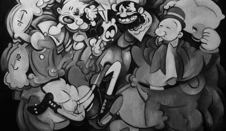 This artwork is a striking depiction of a modern dystopian nightmare, capturing the essence of social discourse and turmoil. Through the lens of consumerism, self-gratification, narcissism, and segregation, it reflects the unsettling realities of our society. Utilizing popular iconography and distortions of modern media, the artwork invites viewers to confront the darker aspects of contemporary life.